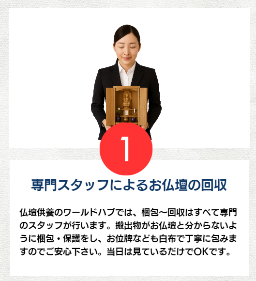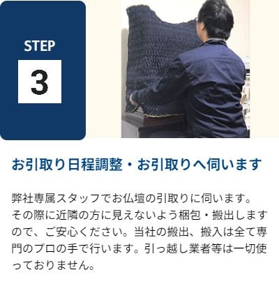 - ・一緒に処分する仏具や、仏壇内にある仏具を取り出して段ボール(1つにつき3,000円)にお入れください。